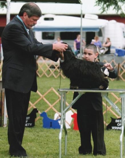 Grandson Jordan at 7 years old with his black & tan puppy on the table, stacking him correctly and helping out his grandparents with the dogs. 2009 |