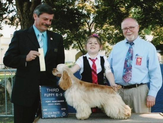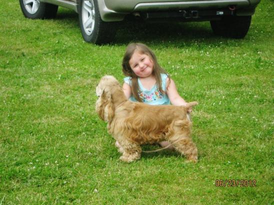 Grandaughter Jasmine at 5 years old gets a ribbon and a picture at the Fort Vancouver Cocker Specialty in June of 2009 under Judge Mr. James Fehring. |