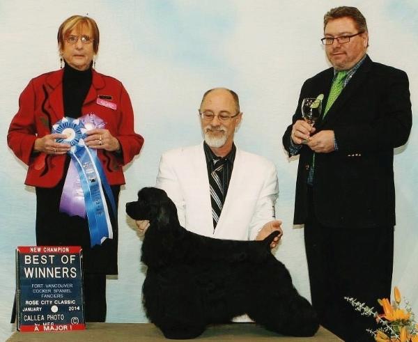 Best of Winners and a New Champion at the Fort Vancouver Cocker Specialty Show January 15th 2014, owner handled by a very happy Ron under Judge Mrs. Jean Austin. OFA Good, Eyes Clear 7-2014, Patellas Normal |